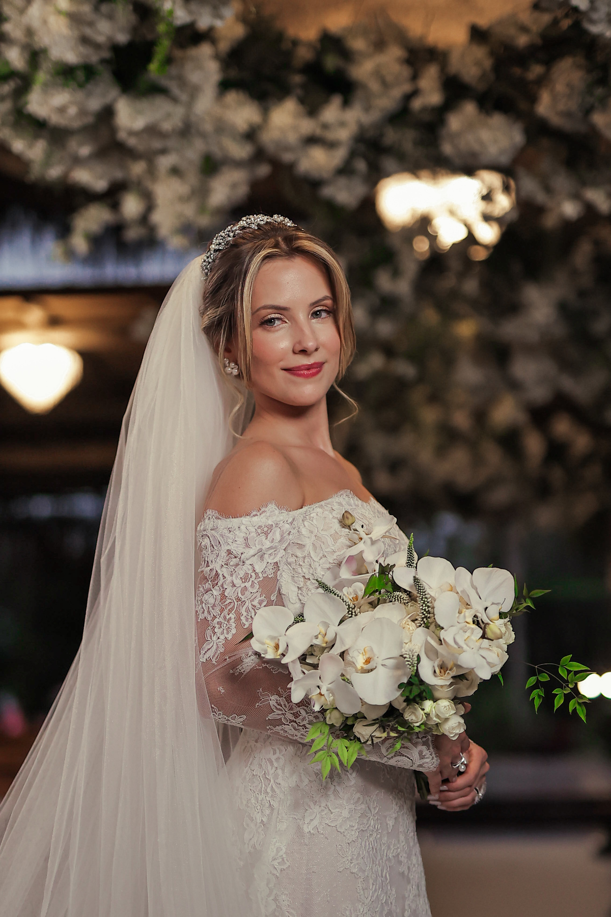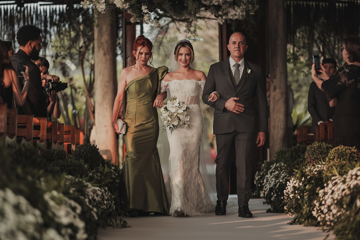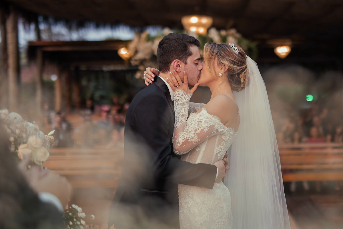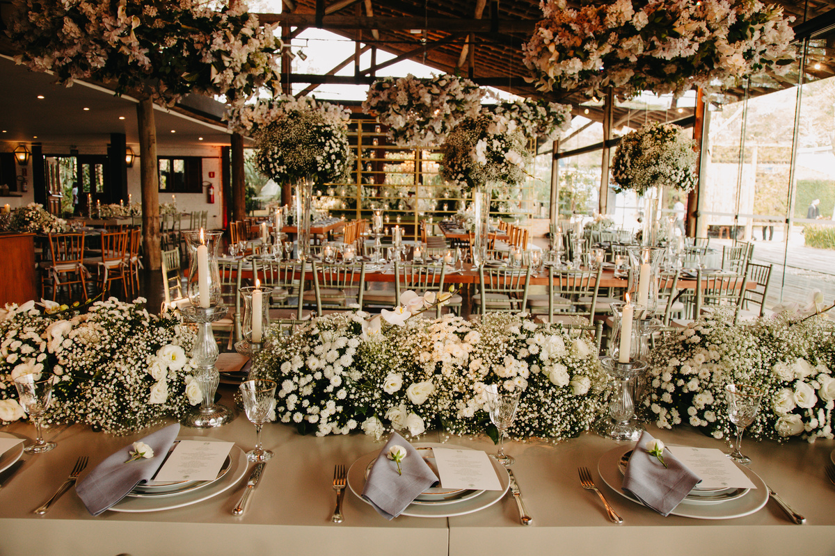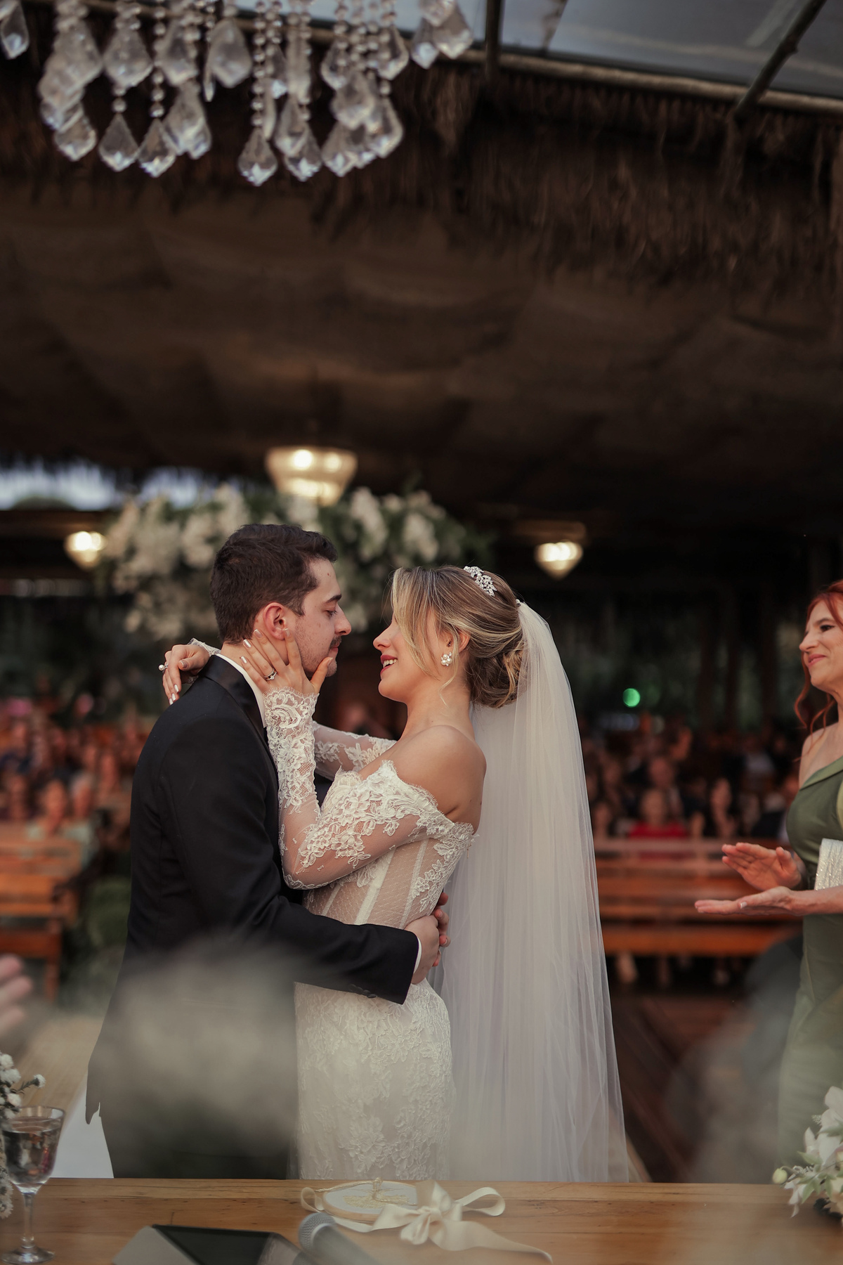 A cerimônia aconteceu sob uma estrutura de madeira cercada por flores brancas e folhagens, criando um altar digno de um conto de fadas. Já a recepção trouxe um verdadeiro espetáculo visual: lustres imponentes, arranjos suspensos e velas que deram um brilho especial à noite. A paleta de cores neutras, combinada com toques de prata, trouxe um charme atemporal.