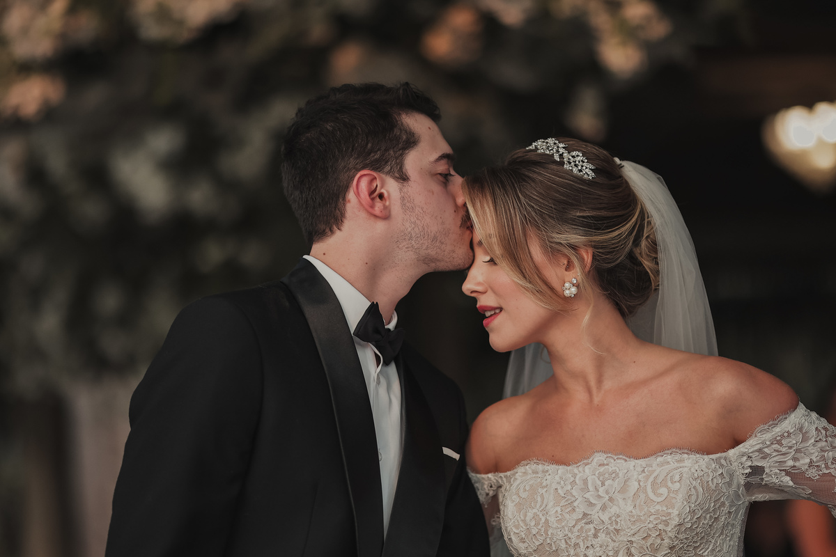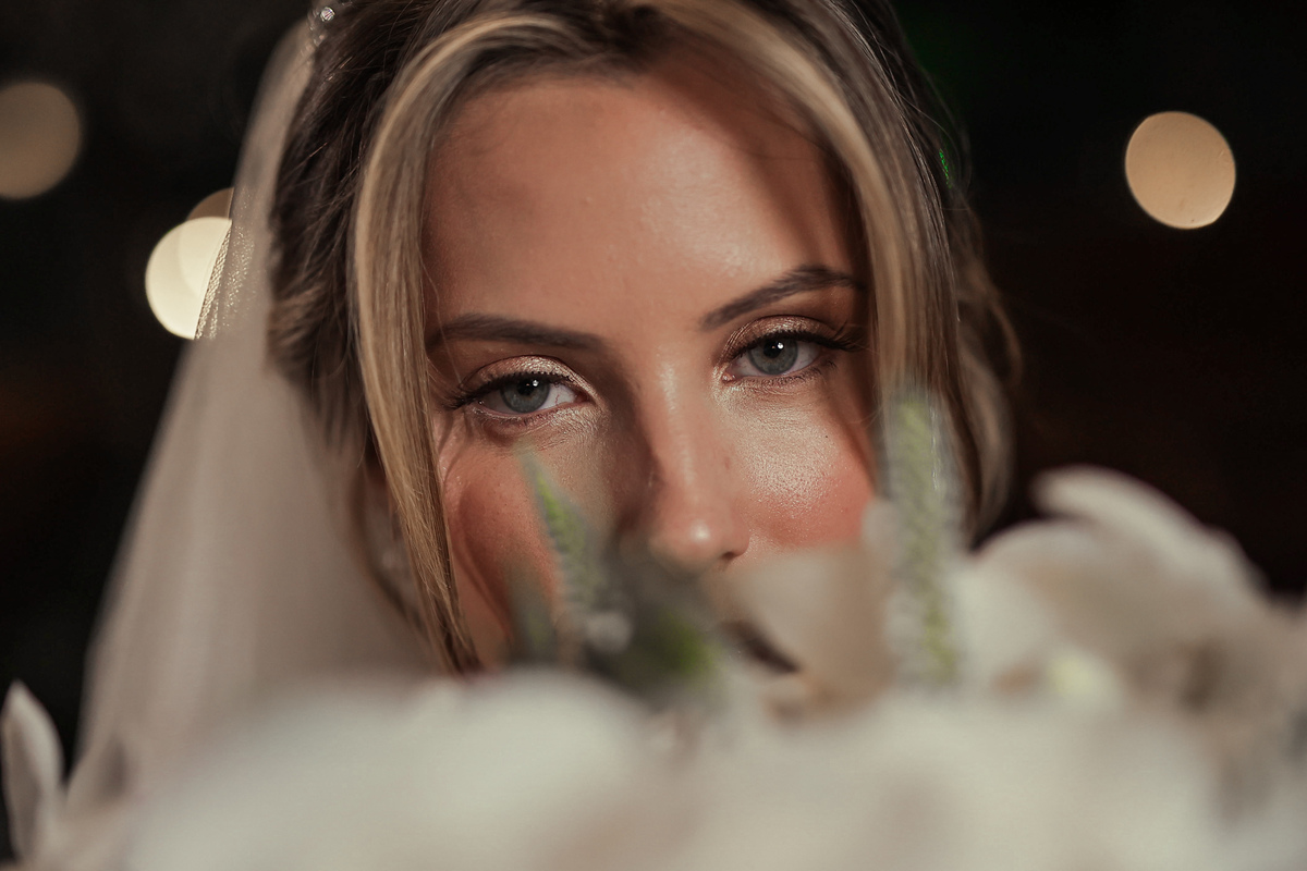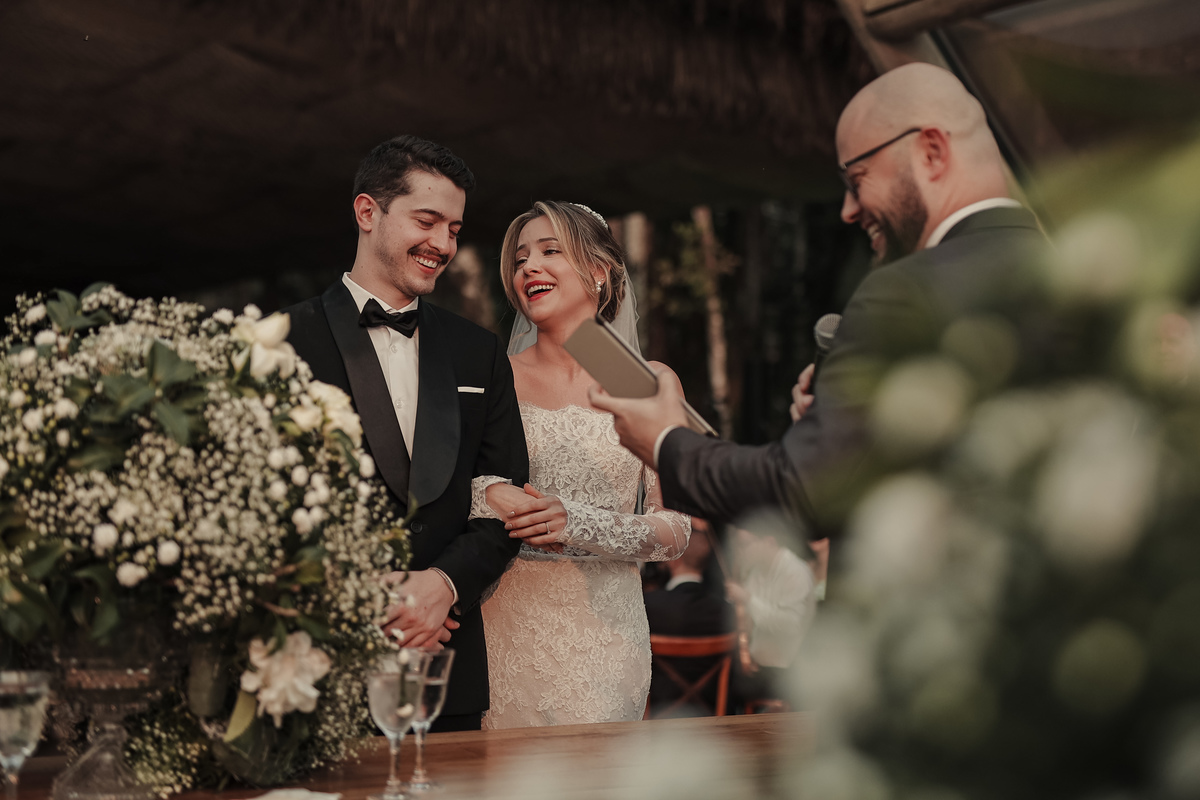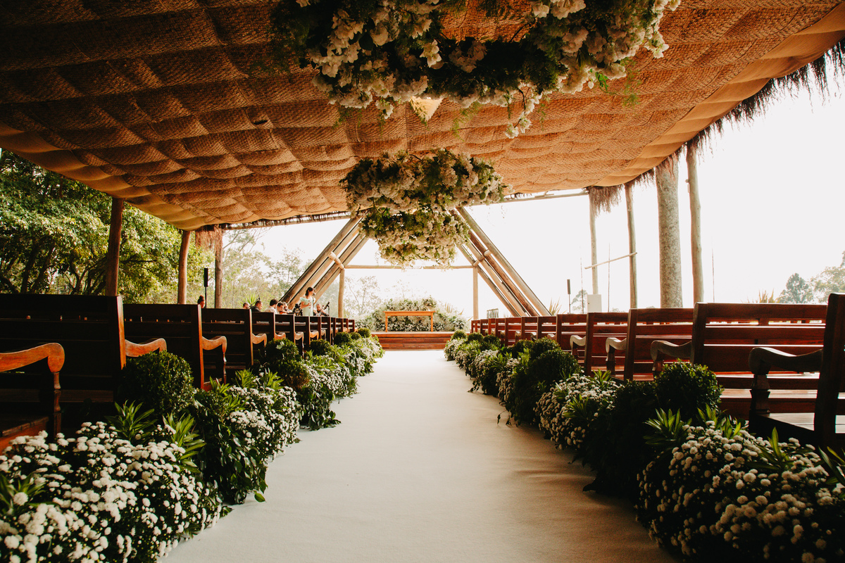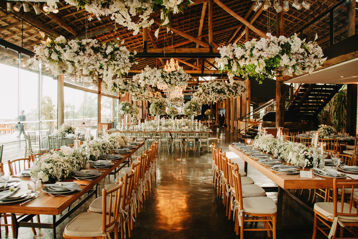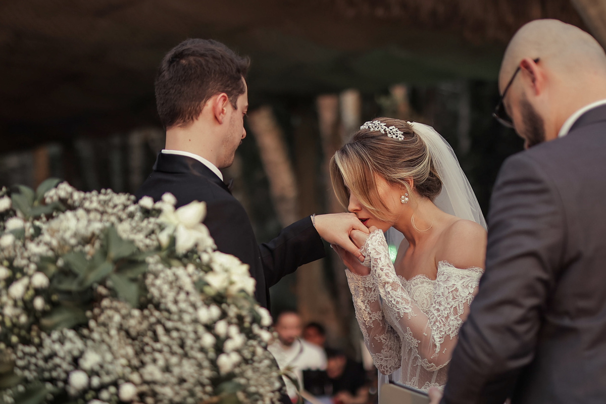 A cerimônia aconteceu sob uma estrutura de madeira cercada por flores brancas e folhagens, criando um altar digno de um conto de fadas. Já a recepção trouxe um verdadeiro espetáculo visual: lustres imponentes, arranjos suspensos e velas que deram um brilho especial à noite. A paleta de cores neutras, combinada com toques de prata, trouxe um charme atemporal.