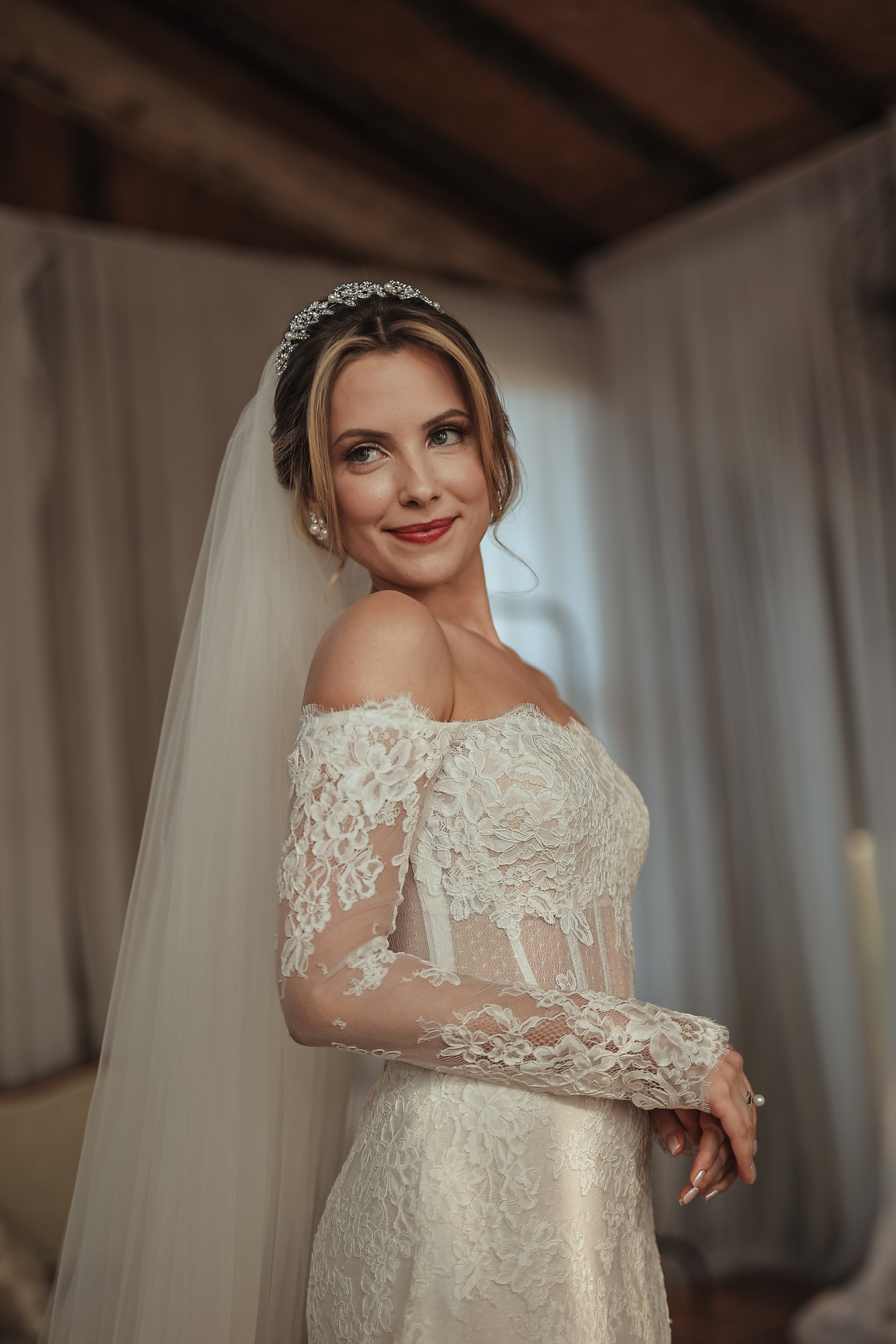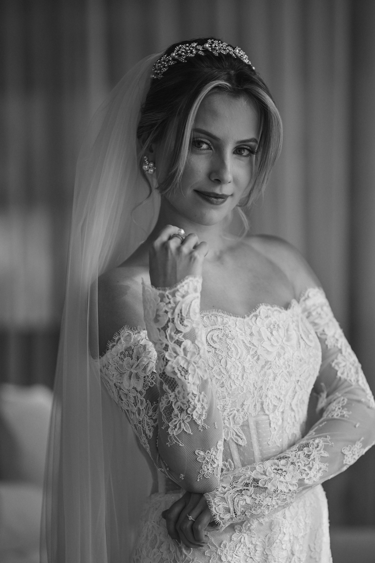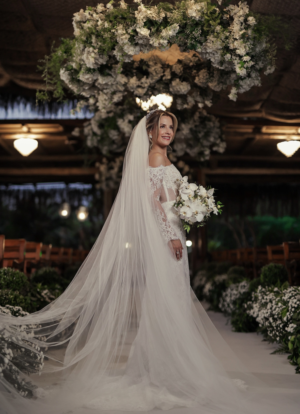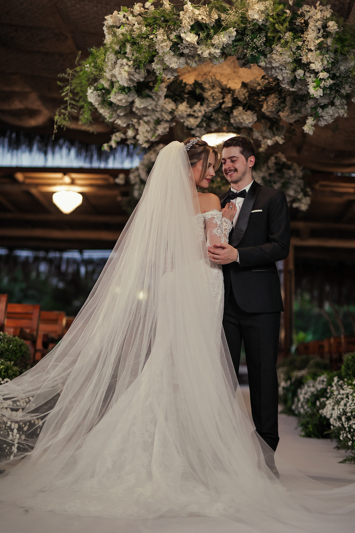 Brenda estava deslumbrante em seu vestido de renda com mangas longas, um modelo romântico e sofisticado. O véu longo completava a produção com um ar clássico. Matheus, com um smoking impecável, trouxe a imponência e elegância que a ocasião pedia.